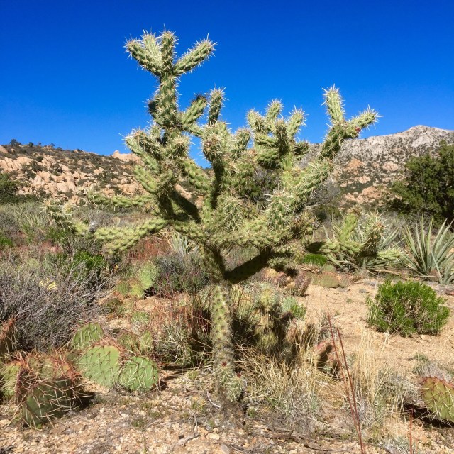 It is tempting the think of the Mojave from afar, as a desert. While there are portions that match that cliche, most of it is a varied environment both beautiful and surprising. Caruthers Canyon is broad u-shaped canyon at 5,400 feet of elevation the walls of which are the southwestern peaks and ridge lines of the New York Mountains. Camped hard against the absolute head of the canyon, with a 7,500 foot mountain on the southwest rim I am amidst pinyon pine, at least three different varieties of cacti, juniper, desert wildflowers and sage. A few yards from camp a seep spring moistens the head of a wet water creek that, by all evidence, runs rough and wild out the canyon when the rains are present. The camp is tracked by deer, coyote and lynx tracks and it is as remote and unviolated as you can possibly imagine. Certainly others have been here, both recently and over the years, but such is the Mojave that the only proof lies in the sandy two-track 4×4 road you must navigate to get here. It is a special place.