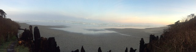 We awoke to a clear, cold morning with the Pacific finally earning its namesake washing rhythmically against the sand under a slightly blushing eastern sky, The tide was low, but coming in, and a mile or so walk down the beach was just what the doctor ordered for breakfast. Part of the way along we heard eagles, which we spotted overhead a hundred or so feet away on a lone Spruce bow. It was a pair, and securing what all women know of all males, regardless of species, the male eagle was pestering for a little sunrise action. He got it, literally while we watched, and we moved on down the beach somehow ashamed of our intrusion.