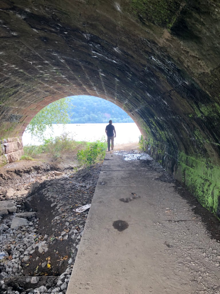 Most of the streets of Duncannon that lead down to the Susquehanna end by draining under stone arches of the railroad line that follows the river. I thought they were picturesque and wanted to go down to the river and under one of the arches. It’s very sketchy in a methamphetamine/oxycodone sort of poor Appalachian way, but it does look cool. We walked under the dank, moody archway while a garbage train was parked above on the tracks, steaming and stinking. Just under the archway, the river looked like a painting in the approaching storm, and we were so focused on it we didn’t really notice the guy leaning against the backside of the arch as we passed through. He was having a coffee and smoking a cigarette and he was in the mood to chat. My partner wandered along the river while I engaged the local.